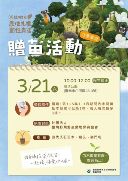 此外,林業及自然保育署嘉義分署也到場進行生態保育宣導,推廣愛護山林與植樹綠化理念。民眾只要憑1張紙本發票即可兌換樹苗,每人每次最多可領取3株,數量有限、換完為止,鼓勵大家以實際行動支持環境永續。