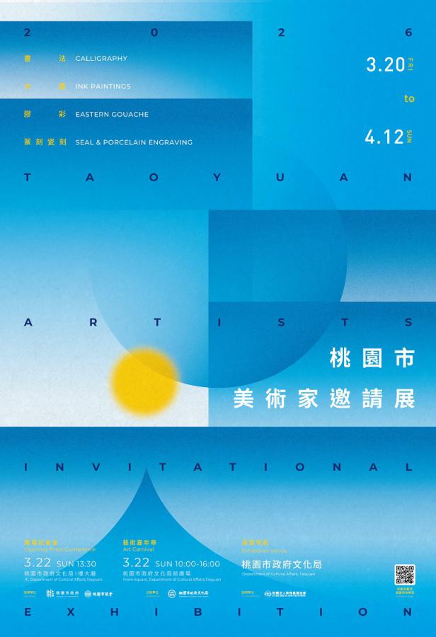桃園市政府文化局年度指標性大展「2026桃園市美術家邀請展」,於3月20日至4月12日於文化局全館展出。本屆以「東方美學」為核心,匯聚131位在地藝術家,聚焦書法、水墨、膠彩與篆瓷刻四大媒材,展現傳統藝術在當代的轉化與創新能量。展覽透過筆墨韻律與金石意象,呈現世代對話下的多元風貌與文化底蘊;主視覺則將「二零二六」融入設計,讓數字「六」化為旭日,象徵日出東方,寓意東方藝術持續綻放光彩,展現桃園藝壇蓬勃發展的生命力。