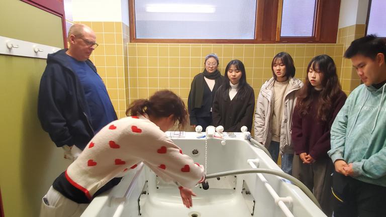 進入臨床實習後,小兒物理治療部門帶來深刻體驗。不同於傳統醫療空間的冰冷氛圍,該部門以童趣設計營造療癒環境,透過細膩空間安排減輕病童焦慮,展現醫療人文關懷。同時,臨床專業要求極為嚴謹,從早產兒到青少年患者皆需精準照護,甚至每次使用後都需全面清潔大型球池設備,確保治療安全。德國實習生高度投入與精準執行力,也讓義守學生重新省思專業標準。另一重要體驗則來自安寧緩和病房,透過藝術創作與自然環境設計,讓病患在生命末期仍能維持尊嚴與生活感,讓學生深刻理解醫療不僅是治療,更是陪伴與尊重。