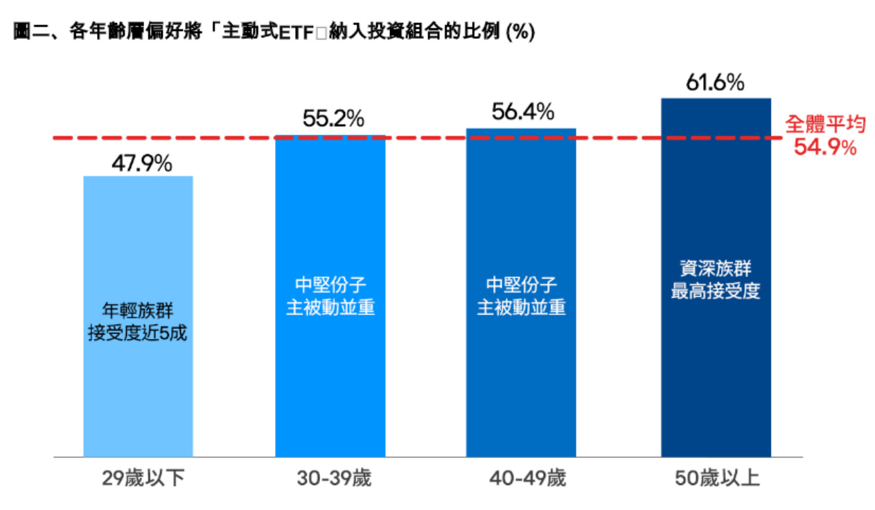 此外,調查數據也顯示,在所有受訪者中,平均有55%的比例願意將主動式 ETF納入投資組合,29歲以下的年輕族群有47.9%,50歲以上的投資人更高達61.6%,顯示台股主動式ETF已越來越受投資人青睞。