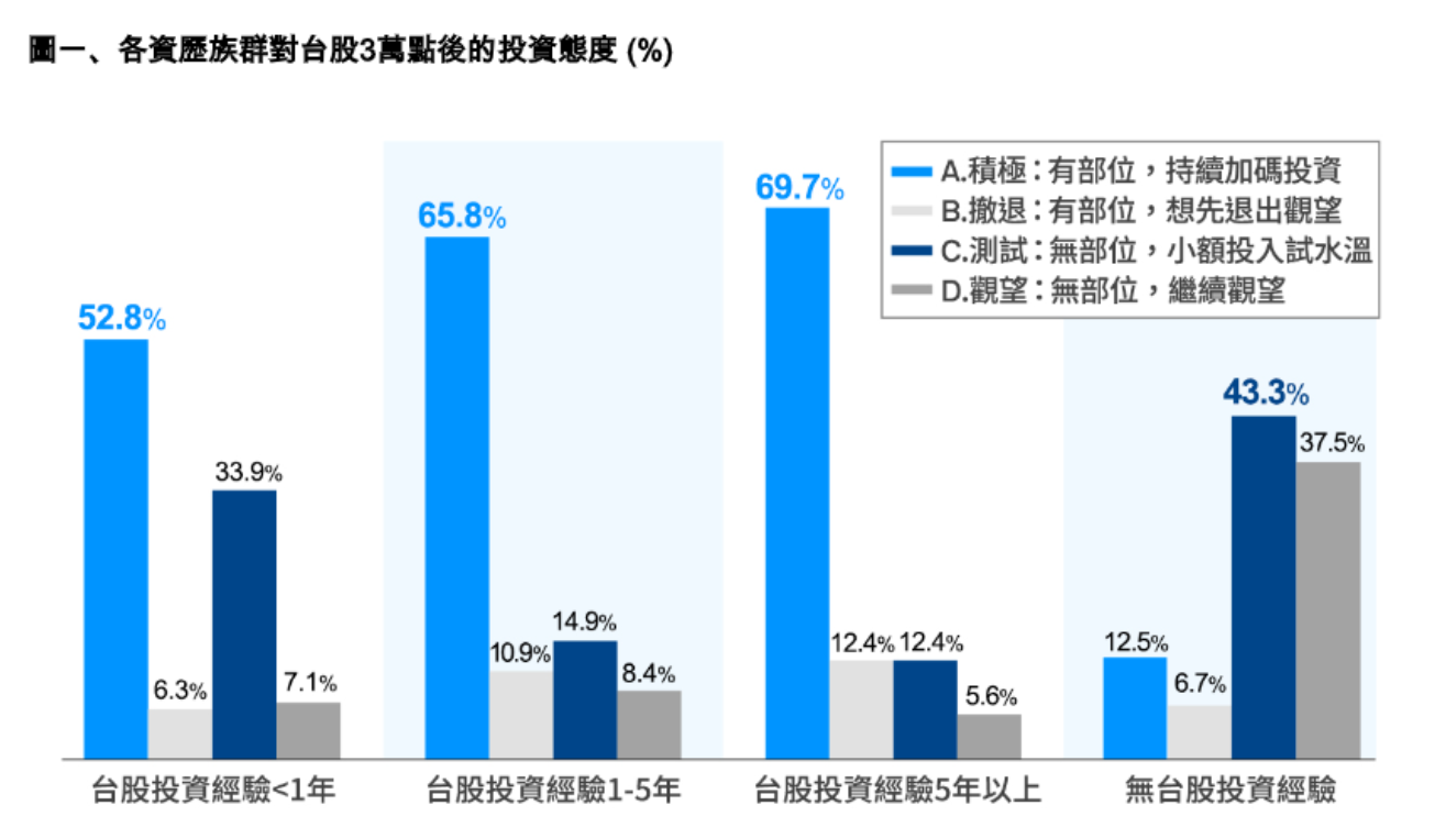 摩根投信指出,調查顯示對於這波台股的震盪,「資歷越深、越敢加碼」;尤其是投資經驗在 5 年以上的台股投資人,積極加碼的意願更高達69.7%;而經驗在一年以下的投資人,加碼意願也有52.8%,即便毫無經驗的投資人,願意小試水溫的比例也有 43.3%;顯示投資台股已成為跨年齡的主題。