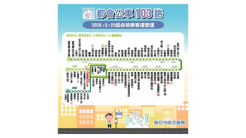 臺南市政府市區公車路網重整計畫又有新路線通車了,第3條都會公車「103路」於115年3月25日起營運,「103鹿耳門聖母廟-臺南火車站-仁德後壁厝」為原3路公車升級,由北至南串聯安南區、北區、中西區、東區及仁德區,每日提供76班次,旨在提供市民更為直截、密集的公共運輸選擇。