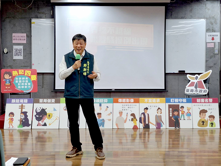 黃偉哲市長表示,校園應是學生最安全的學習環境,市府責無旁貸守護孩子的身心安全。隨著《跟蹤騷擾防制法》施行,校園性別平等教育更應落實於日常人際互動之中,建立尊重他人界線的觀念。市長指出,凡與性或性別有關,且違反當事人意願並反覆持續的盯梢、尾隨、通訊騷擾或冒用個人資料等行為,均可能構成跟蹤騷擾並涉及法律責任,最重可處5年以下有期徒刑。市府將持續透過教育與宣導,讓學生了解法律規範與自我保護方式。