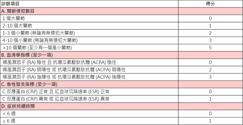 2010年美國風濕病醫學會與歐洲風濕病醫學會建議類風濕性關節炎診斷分類標準