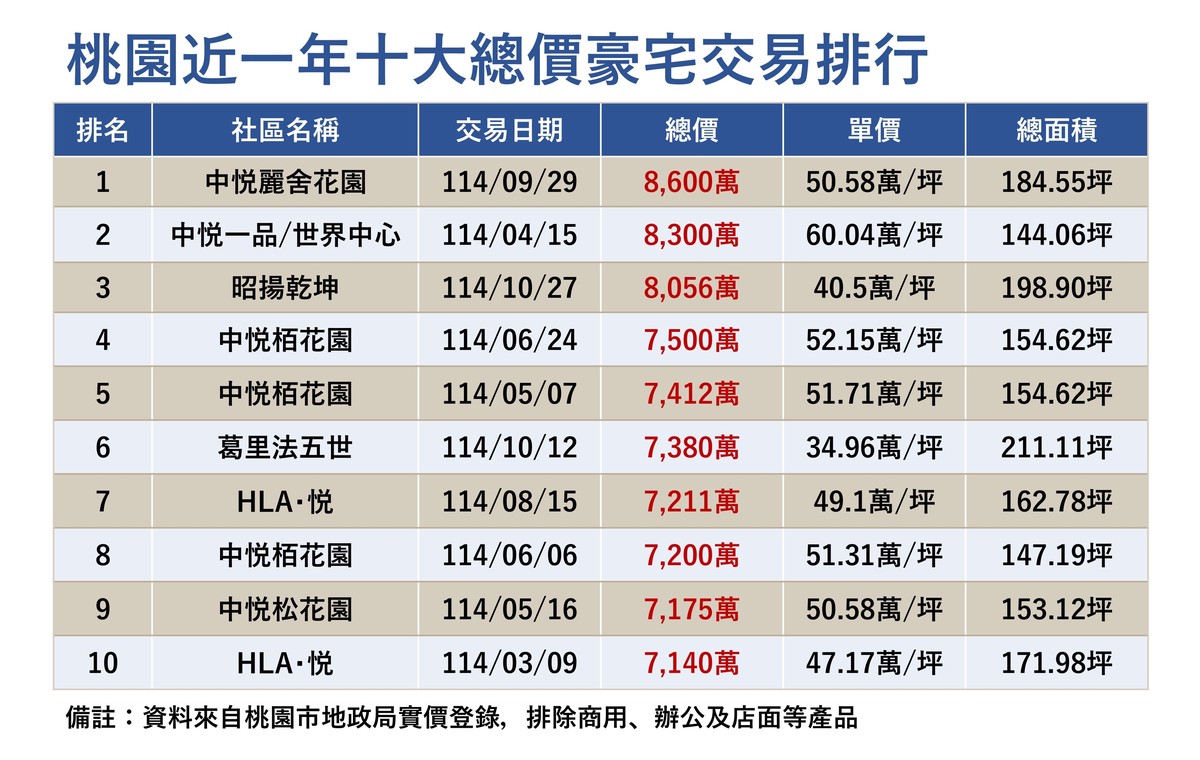 觀察2025年至今桃園十大總價豪宅排行榜,數據精確反映高端客層對「品牌」與「規格」的品牌忠誠度,榜單首位由「中悦麗舍花園」以8600萬元奪冠,緊隨其後的「中悦一品」更以每坪60.04萬元立下成屋豪宅單價天花板,從前十大榜單分析,中悦建設機構的作品即佔據過半席次,顯見在市場產品普遍縮減坪數的趨勢下,具備品牌口碑且堅守百坪豪奢格局的作品,仍是高端買方心中真正好住,且具備傳承價值的核心資產。