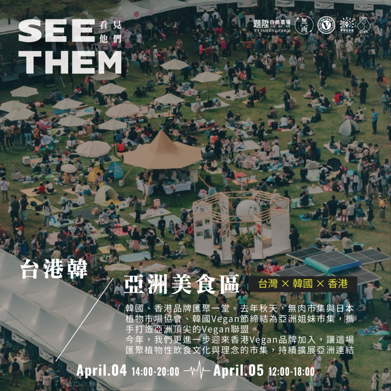 由題陞自然農場與純植行動聯盟主辦的 Vegan Asia 無肉市集,將於 2026 年 4 月 4 日至 4 月 5 日於台北表演藝術中心舉辦年度主題策展《看見他們 See Them》。本次活動結合「六感沉浸式策展」、「跨界音樂展演」與「亞洲百大 Vegan 跨國市集」,以打破人類本位視角為核心,透過藝術與生活提案,引領大眾重新思考人類、動物、土地與未來之間的共生關係。