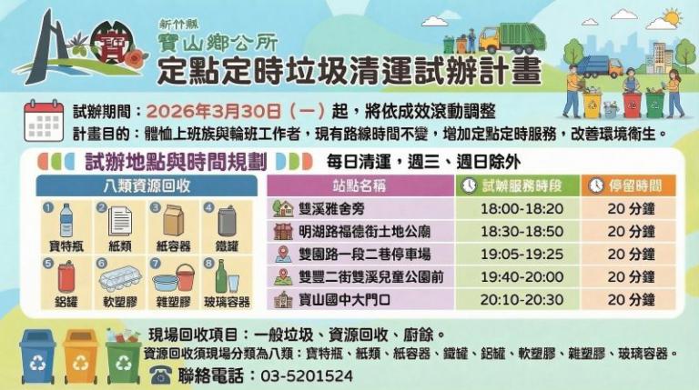 新竹縣寶山鄉公所為提升垃圾清運服務品質並兼顧多元生活型態需求,自3月30(一)日起,正式推動「定點定時垃圾清運試辦計畫」,期望透過更彈性的清運方式,提供鄉親更便利的生活服務,進一步改善環境衛生。