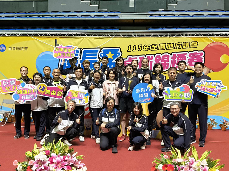 由苗栗縣議會主辦的115年全國地方議會議長盃桌球錦標賽27日圓滿落幕,經歷兩天激烈競技,臺南市議會表現亮眼,拿下議員組團體賽季軍、職員工女子組團體冠軍及職員工男女混合組雙打冠軍等15個獎項,展現臺南市議會的深厚實力與團隊凝聚力。