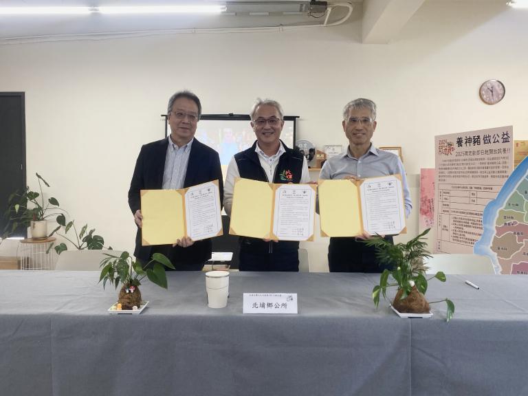 ▲北埔鄉公所今(30)日舉辦「北埔永續文化共創與ESG行動計畫」三方合作簽署記者會,由北埔鄉長莊明增、清大韌性研究中心主任林福仁(圖右)、采鈺科技副總經理黃文榮(圖左)共同簽署合作備忘錄。(圖 / 記者俞婷攝)
