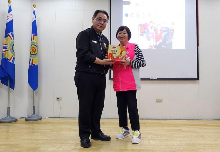 會議中表揚資深志工田涂玉雲,感謝她長期秉持熱忱與奉獻精神,持續關懷與服務榮民及眷屬,對榮民眷照顧工作貢獻良多,田涂玉雲長年默默付出,深獲各界肯定,堪為志願服務之典範,並由鞠宗顯處長親自頒贈禮品
