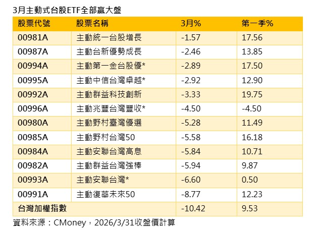 台股3月修正幅度高達10.4%,主動台股ETF雖然無法逆勢上漲,但仍全部贏過大盤,其中,4檔跌幅在3%以內,包括主動統一台股增長(00981A)、主動台新優勢成長(00987A),及主動第一金台股優(00994A)等,且拉長時間來看,首季漲幅介於13%至17%,績效領先。