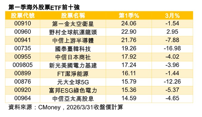 首季行情偏空,不過,ETF還是有逆勢上漲的強勢標的出現。檢視第一季海外股票ETF,漲幅前十強主要類型包括低軌衛星、航運、半導體、電力、綠能等主題型ETF,其中,第一金太空衛星(00910)漲幅達24.06%,表現最佳,其餘還有2檔海外ETF漲幅也逾兩成,包括野村全球航運龍頭漲幅22.90%,中信上游半導體漲幅21.76%。