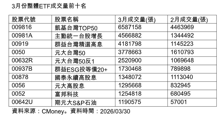 其中,凱基台灣TOP50(009816)、主動統一台股增長(00981A)、群益台灣精選高息(00919)、元大台灣50(0050),及元大台灣50反1(00632R),3月成交量都超過250萬張。
