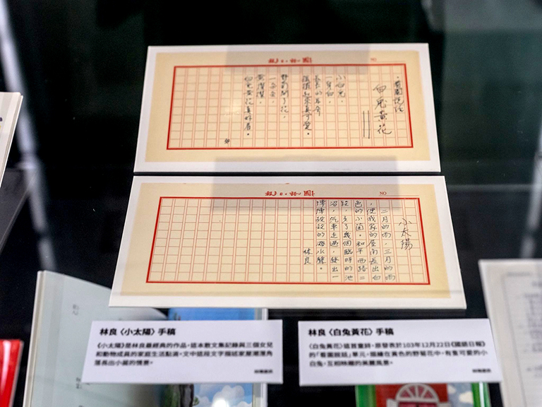 ▲兒童文學作家林良〈小太陽〉手稿及〈白兔黃花〉手稿等珍貴文物,由林瑋提供本次「玩家登入:兒童文學特展」展出。