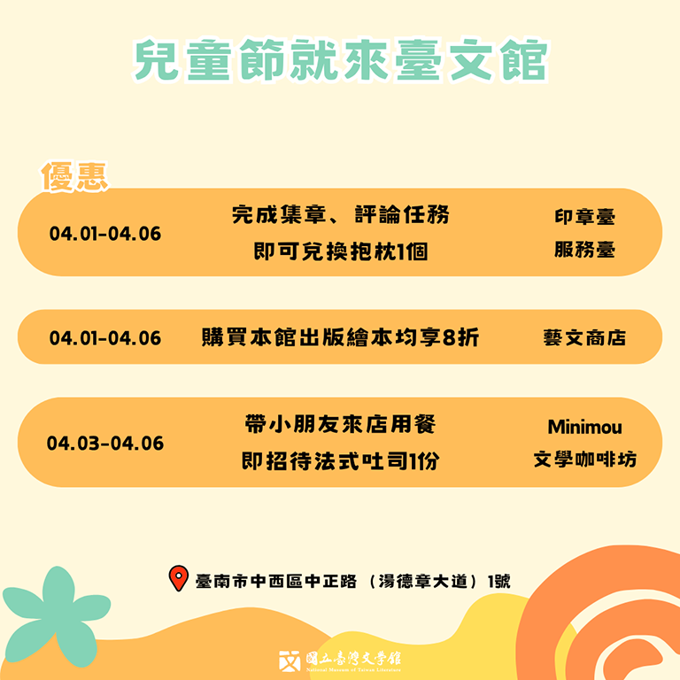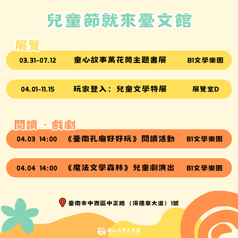 活動地點:國立臺灣文學館B1文學樂園(臺南市中西區中正路(湯德章大道)1號B1)