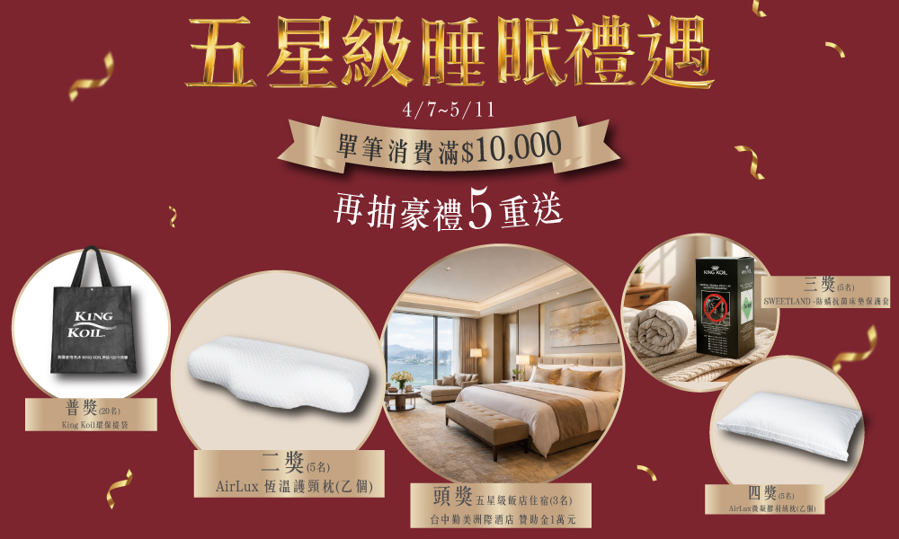 ”五星級禮遇”抽獎活動辦法請見官網連結或洽美國金格名床各門市百貨專櫃