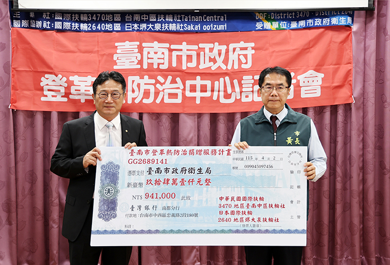 黃偉哲表示,登革熱防治是台南市每年至關重要的公共衛生工作,必須仰賴政府與民間攜手合作才能有效防堵疫情。此次非常感謝台南中區扶輪社秉持社區服務精神,邀集國際扶輪3470地區、2640地區日本堺大泉扶輪社共同推動「2025-26 國際扶輪全球獎助金Global Grant專案(GG 2683141)-台南市登革熱防治捐贈服務計畫」,鼎力支持台南市的登革熱防治工作,充分展現扶輪社回饋社會的用心,以及發揮強大的公私協力精神。
