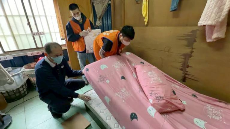 ▲慈濟志工協助更換新購置床包組,營造舒適睡眠環境,展現對學子的關懷。 (圖/記者蔣彤雲攝)