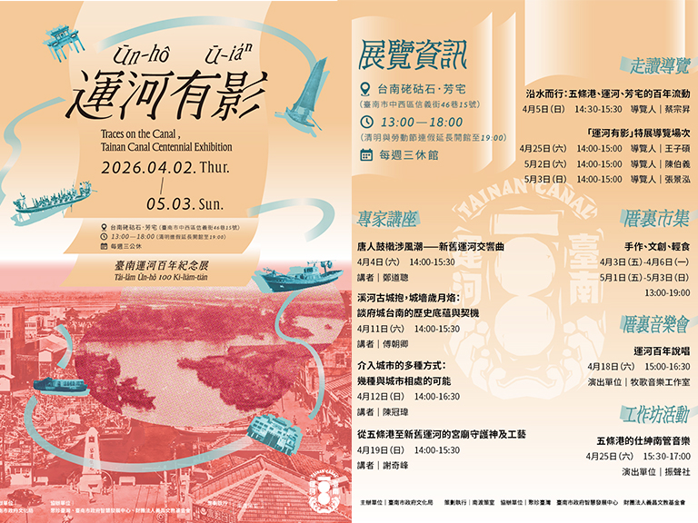 臺南市政府文化局進一步說明,特展選在鄰近運河的百年芳宅展出,是要透過老宅新生呼應運河更迭、與日常並進的形象,也藉由環境反映早期城市風貌。而這項特展更是市府整合多部門辦理的重要活動項目之一。展覽期間將舉辦多場特展導覽、講座、工作坊、音樂會、走讀與市集活動,藉由展覽與推廣,不僅希望民眾了解運河過去,也期望大家一同思考運河與城市的關係,想像未來可能。