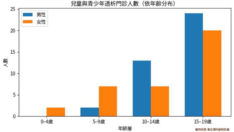 衛生福利部統計處《113年度全民健康保險醫療統計年報》顯示,0至4歲族群中,全國僅女性2人接受透析相關門診服務,男性為0人;5至9歲族群中,男性2人、女性7人;10至14歲族群則為男性13人、女性7人;15至19歲族群略為增加,男性24人、女性20人。