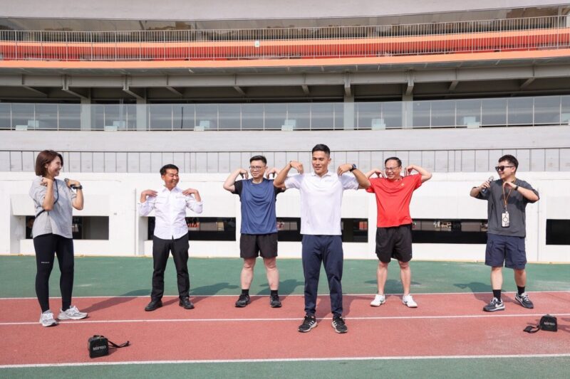 接續登場的鉛球投擲比賽成為全場焦點。賴瑞隆以過去鉛球選手身分親自示範標準動作,出手俐落、架勢十足,展現紮實基本功,最終順利拿下勝利。