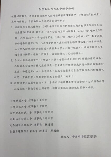美伊戰爭導致國內塑膠原料價格上漲、供應減少,引發「塑膠袋之亂」,立委質疑台塑石化公司「假減產、真哄抬」行為。台塑企業南區六大工會九日發表聯合聲明,提出營銷紀錄自證清白,嚴厲譴責不當指控,並籲請媒體善盡查證責任,以維護產業穩定並避免影響勞工士氣。