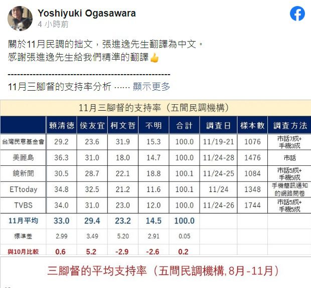 小笠原欣幸今天(3日)在臉書上表示,他參照了11月各大機構的民調數據,梳理了三腳督的支持率。他認為,能與8月、9月、10月數據進行比較的機構包括台灣民意基金會、美麗島、鏡週刊、ETtoday和TVBS這五間。