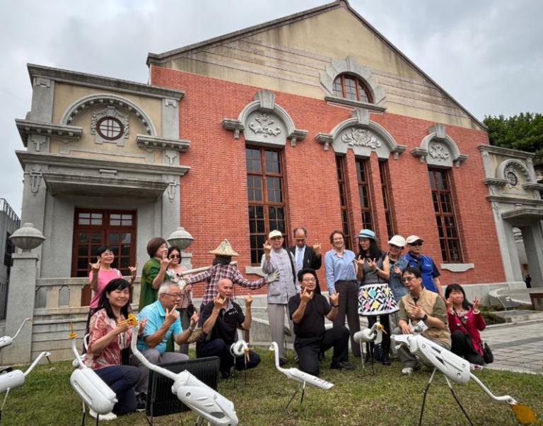 ▲展出藝術家范揚清與會貴賓在新竹公會堂前合影。(圖/記者蔣彤雲攝)