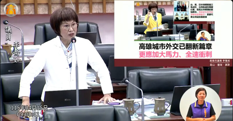 李喬如強調,高雄正站在邁向國際的重要門檻上,城市外交若缺乏人才支撐,將難以長期發展,她要求市府提出具體的外交人才培育擴充計畫與時程,讓高雄成為實質上的國際城市,而且真正具備全球競爭力的「世界的高雄」。