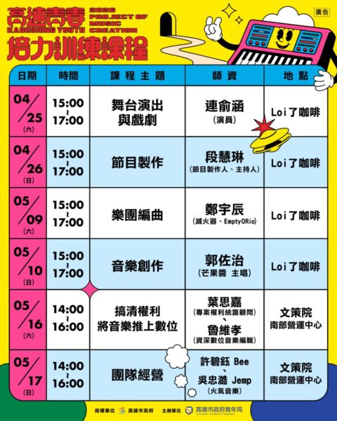 青年局指出,2026「高速青春」首波課程優先錄取設籍、就學或就業於高雄之高中職、大專院校學生,以及35歲以下青年,課程資訊亦將陸續公布青年局官網、FB、IG與 Line@(@youth.kcg),即日起開放網路報名(https://forms.gle/tLuGcDozu2w3bmwW7),號召熱愛流行音樂與藝術表演的青年加入培育行列,開拓更具發展潛力的職涯路徑。