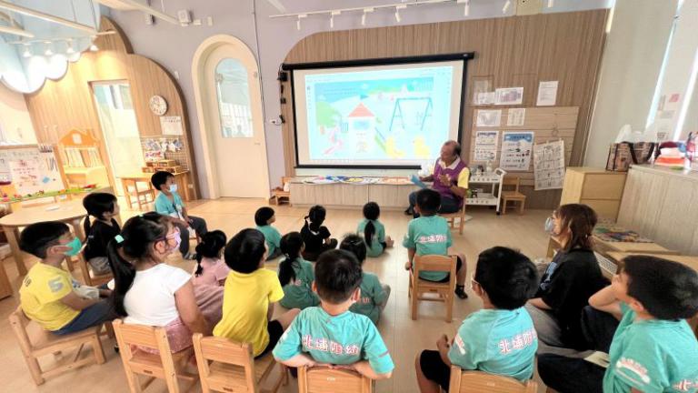 首站今(17)日來到新竹縣北埔鄉北埔國民小學附設幼兒園,以生動活潑的課程設計並結合客語創意教學,引導幼童閱讀廉政繪本《好玩的迴轉滑梯》,讓孩子在故事與遊戲中自然吸收誠信觀念,理解「誠實、正直、守規矩」的重要價值,培養幼童良好品格。