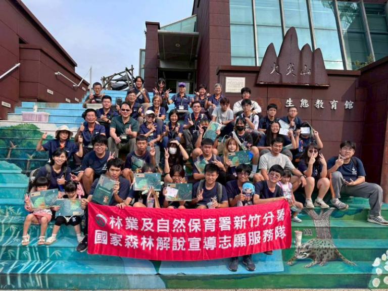 ▲解說志工攜手苗農學子火炎山遊戲闖關活動合照(林業保育署新竹分署提供)。