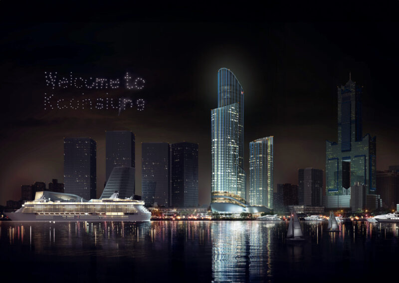 捷運局表示,本案由潘冀聯合建築師事務所規劃設計,規劃 45 層與 32 層兩棟 A 級商辦大樓,並設置商場、餐廳及員工安家宅,共約 5.2 萬坪開發量體,建物將透過空橋與旅運中心串聯,做為「高雄亞灣・鴻海旗艦總部」,亦開放其他科技企業進駐,預估創造 3,000 個就業機會,每年帶來 200 億元產值。透過TOD與捷運聯開案的推動,高雄市不僅展現宜居且高效的都市典範,更為城市注入嶄新活力,朝向國際化現代都市邁進,實現低碳永續的城市願景。