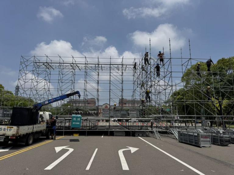 ▲工作人員正緊落密鼓搭建舞台。(圖/記者蔣彤雲攝)
