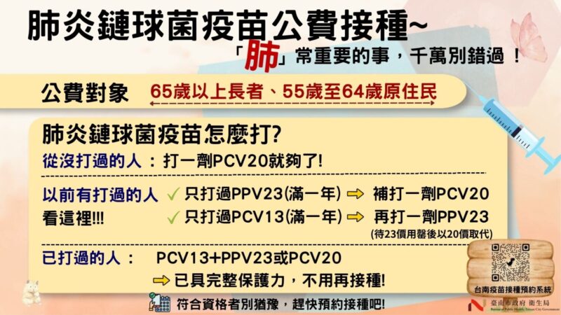 市民亦可利用「台南疫苗接種預約系統」平台進行線上預約(https://health-reservation.tainan.gov.tw/),方便又快速 。呼籲市民及早接種,共同打造健康防護網,守護長者呼吸健康,遠離肺炎威脅。圖/衛生局