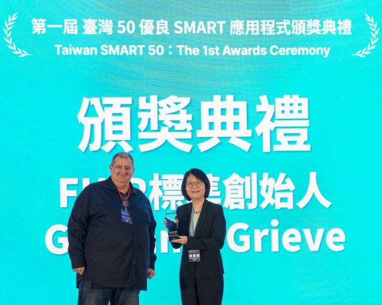 ▲譚慶鼎副院長自 FHIR 標準創始人 Grahame Grieve手中領取「臺灣 50」優良 SMART 應用程式—臨床決策支援類大獎。(圖/新竹臺大分院提供)