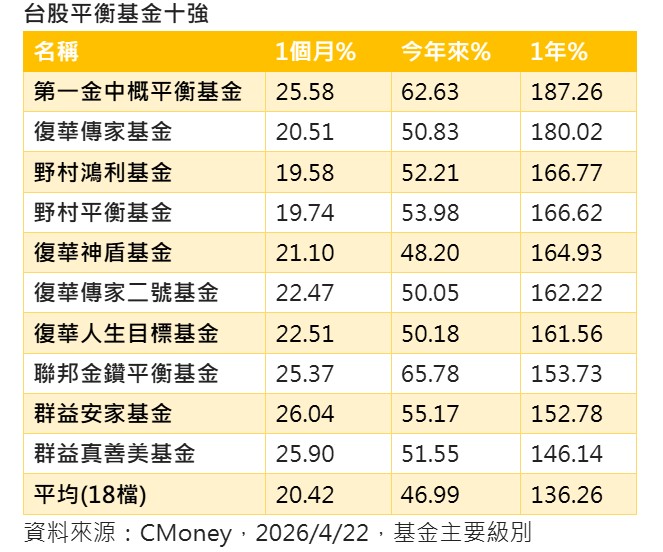 Cmoney資料顯示,台股平衡基金近1個月、今年以來,及近1年平均漲幅分別達20%、47%,及136%。