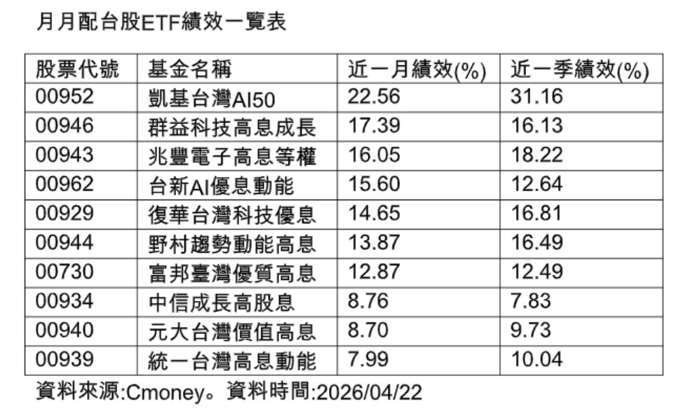 至於近一個月表現較好的月配台股ETF,分別為凱基台灣AI50(00952)、群益科技高息成長(00946)、兆豐電子高息等權(00943)、台新AI優息動能(00962)、復華台灣科技優息(00929)、野村趨勢動能高息(00944),及富邦臺灣優質高息(00730),各自繳出逾12%的含息報酬率。