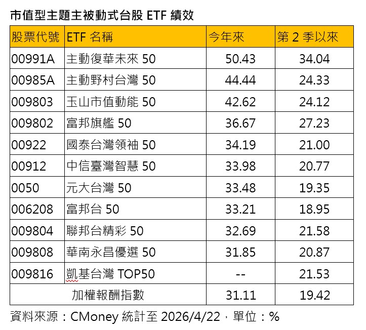 截至昨天為止,台股今年以來漲幅高達31.1%,至少有10檔以大盤市值作為選股策略、名稱有50的主被動式ETF打敗大盤,其中前兩名由主動式ETF包辦,分別為主動復華未來50(00991A)的50.4%、主動野村台灣50(00985A)44.4%,此外,被動式的玉山市值動能50(009803)、富邦旗艦50(009802)也打敗大盤。