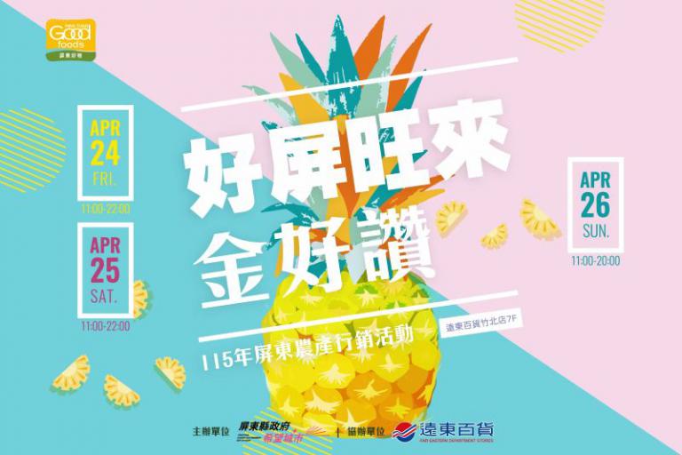 屏東縣政府為推廣屏東優質農特產品及提升屏東農產品牌形象,明(24日)至26日三天在遠東百貨竹北店舉辦「好屏旺來金好讚」屏東農產行銷活動,以屏東代表性農產品「金鑽鳳梨」為主題,屏東縣政府邀請大新竹地區民眾於24日至26日蒞臨活動現場,一同品嚐屏東金鑽鳳梨與在地特色農產品,感受屏東農業的熱情與活力。