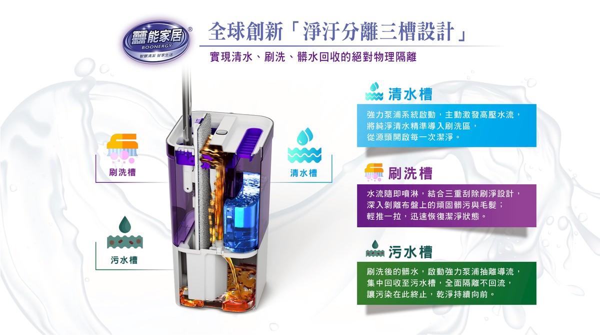 為了解決上述困擾,䨻能科技耗時 8 年,成功開發出「平板淨汙分離䨻能拖」。其核心技術在於榮獲發明專利的「三槽獨立系統」設計。這項創新設計將淨水槽、汙水槽與清洗槽進行了獨立的空間規劃,讓清水與洗滌後的汙水在物理結構上有了明確的分界。
