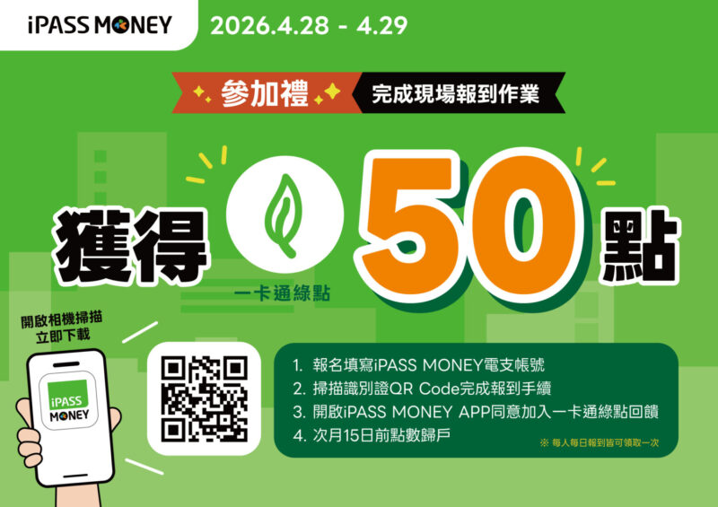 為推動展會數位化,一卡通公司為「AI IMPACT」打造專屬數位通行證。與會者在活動報名時,僅需勾選並填寫 iPASS MONEY 電子支付帳號,即可獲得大會系統產出的專屬報到 QR Code。活動當天現場完成數位報到手續,天天均可領取50 點「一卡通綠點」作為報到加碼禮(1點=新台幣1元),鼓勵低碳生活的數位獎勵,民眾領取後可廣泛應用於低碳消費行為,包含搭乘全台捷運、高鐵、台鐵、公車客運、YouBike等綠色交通工具,或於繳納水電費、停車費及環境部認證之三大超商通路(7-ELEVEN、全家、萊爾富)折抵使用。