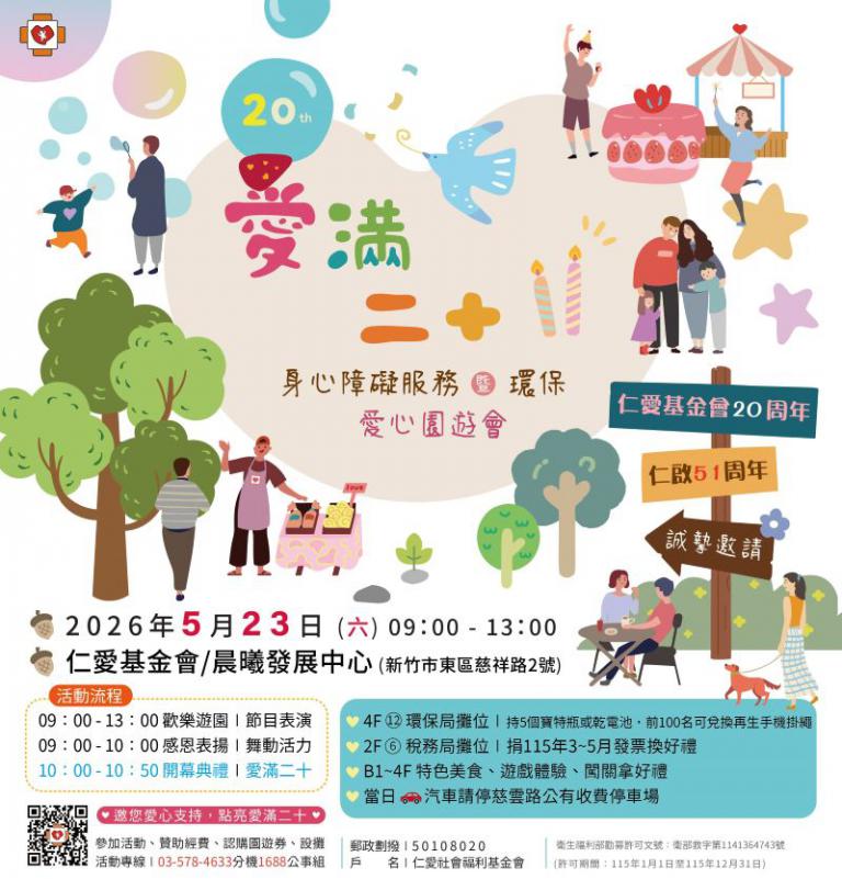 新竹市天主教仁愛社會福利基金會感恩歡慶成立二十年,將於5月23(六)日上午9時至下午1時,在新竹市東區慈祥路2號晨曦發展中心舉辦「愛滿二十.身心障礙服務暨環保愛心園遊會」,豐富活動內容包含仁愛學員舞台表演及手作品展示,並邀請峨嵋樂齡學習中心、大自然快樂操、塏欣幼兒園、聯電鼓隊、慈濟手語班、bobojoi泡泡家族、Sax Fun樂團、旺宏電子豎琴社、開心幸福家族等單位演出,現場有新竹市環保局持寶特瓶或乾電池兌換手機掛繩、稅務局捐發票換好禮、郵局可愛集郵商品等宣導攤位,以及仁愛闖關拿好禮,邀請民眾共襄盛舉,點亮「愛滿二十」的感動時刻。