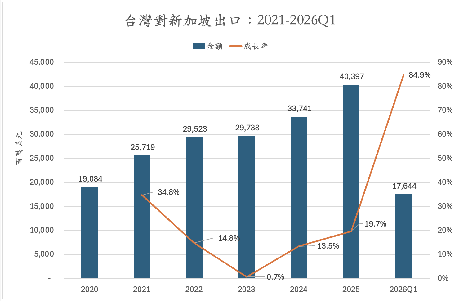 在貿易方面,雙邊關係展現穩定且持續擴張的結構性成長。台灣對新加坡出口自2020年的190億美元,逐步攀升至2022年近295億美元,2023年略為持平後,2024與2025年再度加速成長,並於2025年達403億美元新高。2026年第一季出口金額為176.4億美元,年增84.9%,顯示高成長動能延續。