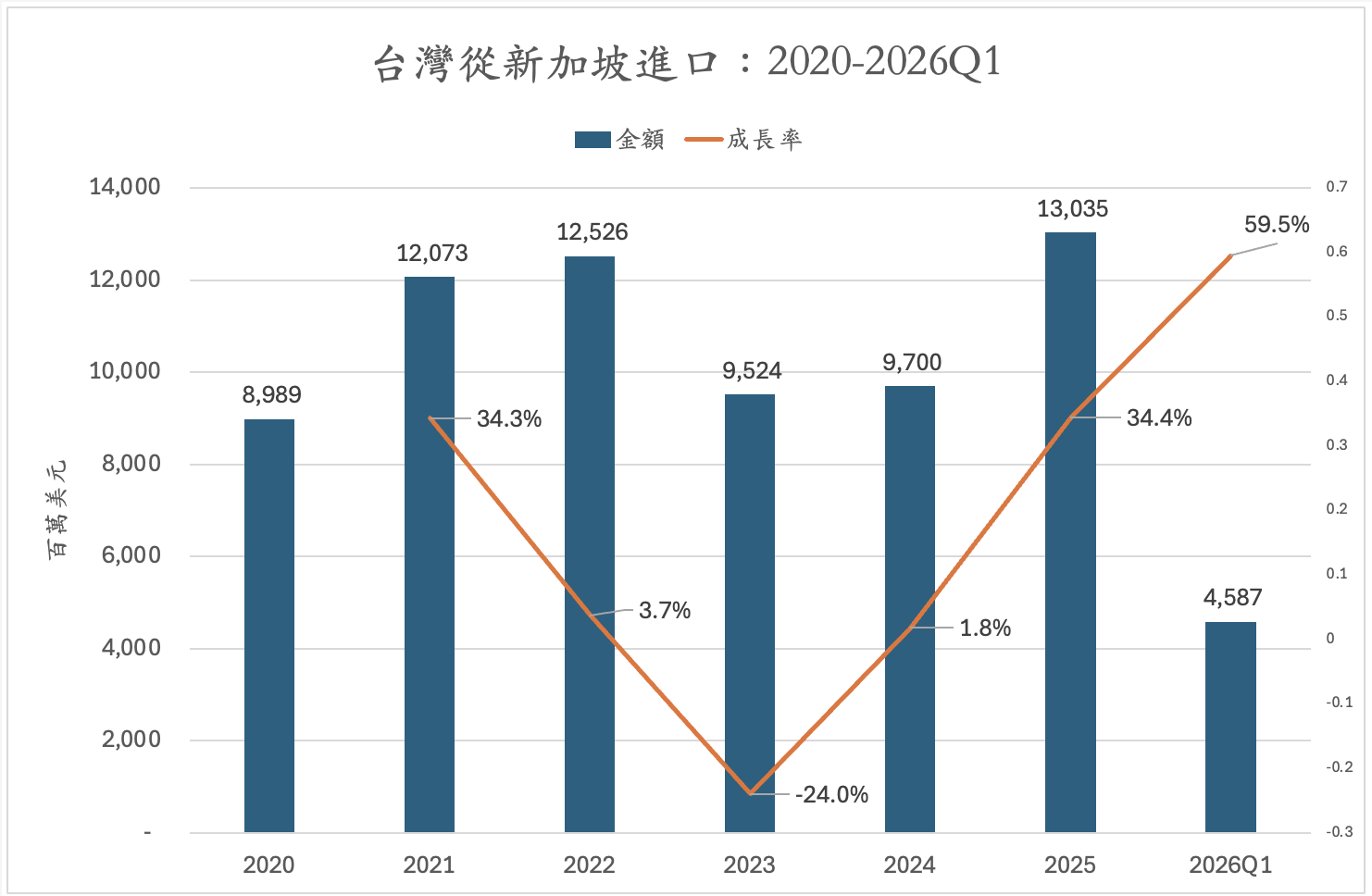 進口方面,台灣自新加坡進口於2022年達125億美元高點後,2023年因景氣循環回落至95億美元,2024年起逐步回升,2025年達130億美元,2026年第一季為45.9億美元,年增59.5%,反映區域供應鏈需求持續擴張與回溫。