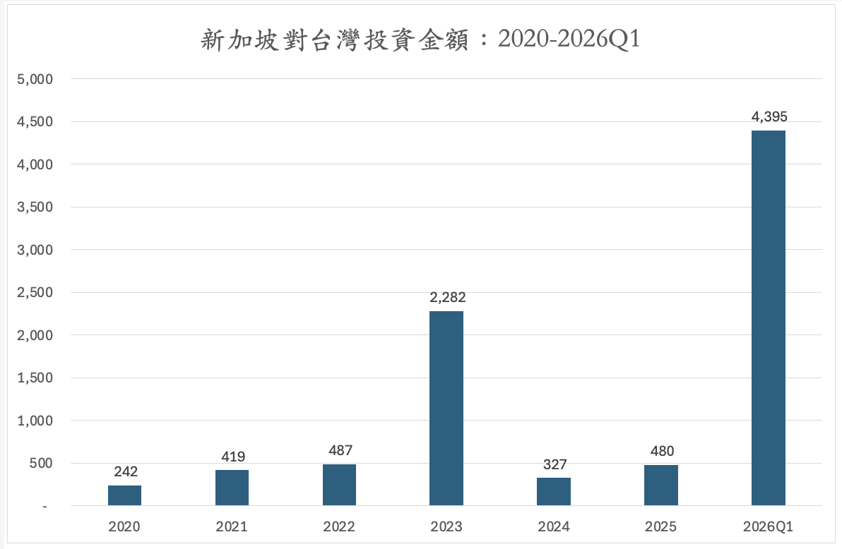 過去五年,台灣對新加坡投資金額長期占對東南亞投資比重近六成,凸顯新加坡作為台商布局東南亞的核心樞紐地位。從年度趨勢觀察,2021年投資達37億美元高峰後,2022至2023年略為回落,2024年再度攀升至58億美元,反映企業在區域布局上呈現「調整—再擴張」的動態過程。2025年回落至22億美元,而2026年第一季已達9億4,200萬美元,年增率高達2,030%,顯示投資動能明顯回溫。