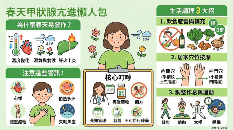 春天在五行中屬「木」,與「肝」相應。肝主疏泄,負責調節氣機與情緒。當春季氣候忽冷忽熱,人體無法及時適應時,容易出現肝氣鬱結或肝陽上亢,進而引發心悸、胸悶、煩躁易怒、失眠等不適。若本身已有甲狀腺亢進體質,更可能因肝火上炎或陰虛火旺,使相關症狀加劇。