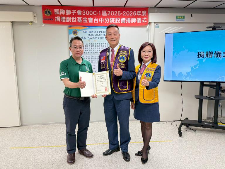 ▲創世台中院陳韋龍院長(左)感謝在林玉彪總監(中)帶領下,集結300C-1區獅友們的愛心及力量,捐助創世台中院迫切需求的照護設備,讓30位院民得到更好的照護服務,也期盼這份愛心能繼續傳遞下去。(圖╱創世基金會提供)