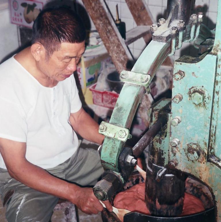 1960年代,黃海瑞展現了過人的研發智慧,他從打鐵機具中獲得靈感,大膽地將機械構造改良為木槌捶打,這項關鍵性的轉型,將產量從每日30斤一口氣提升至500斤。這不僅解決了產能問題,更打破了經濟規模的限制