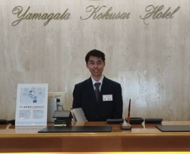 ▲鄧晉帆同學於日本山形國際飯店擔任櫃檯實習時的工作照。(圖/玄奘大學提供)
